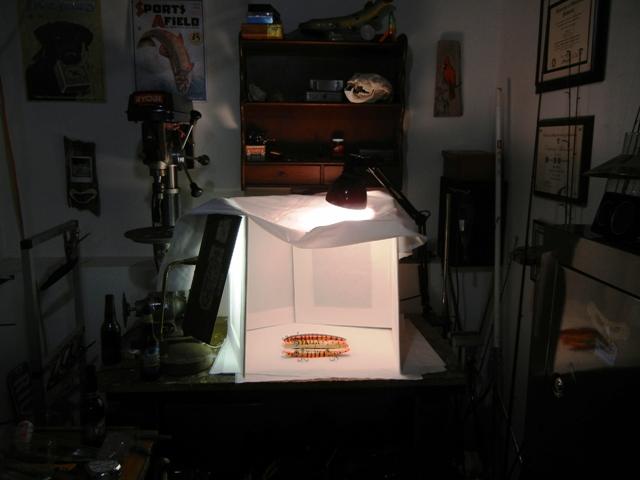 Well I went out and got a new Nikon Coolpix, some white sheets, and then tried taking a few new photos. I think they turned out a little better. I just tried some of the standard camera settings and made a makeshift light-box. I think I may need a bit more light still. Does it look any better than the first pic I posted? Now onto the next project, trying to get some video of the bait’s action in the water. The new camera has HD video capabilities and I know a very clear lake, just need to get up to the cabin now and see what happens. Thanks again for all the help Mike Attachments ---------------- Bluegill 2.jpg (74KB - 222 downloads) workbench turned studio.jpg (40KB - 229 downloads) | |||