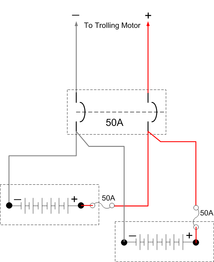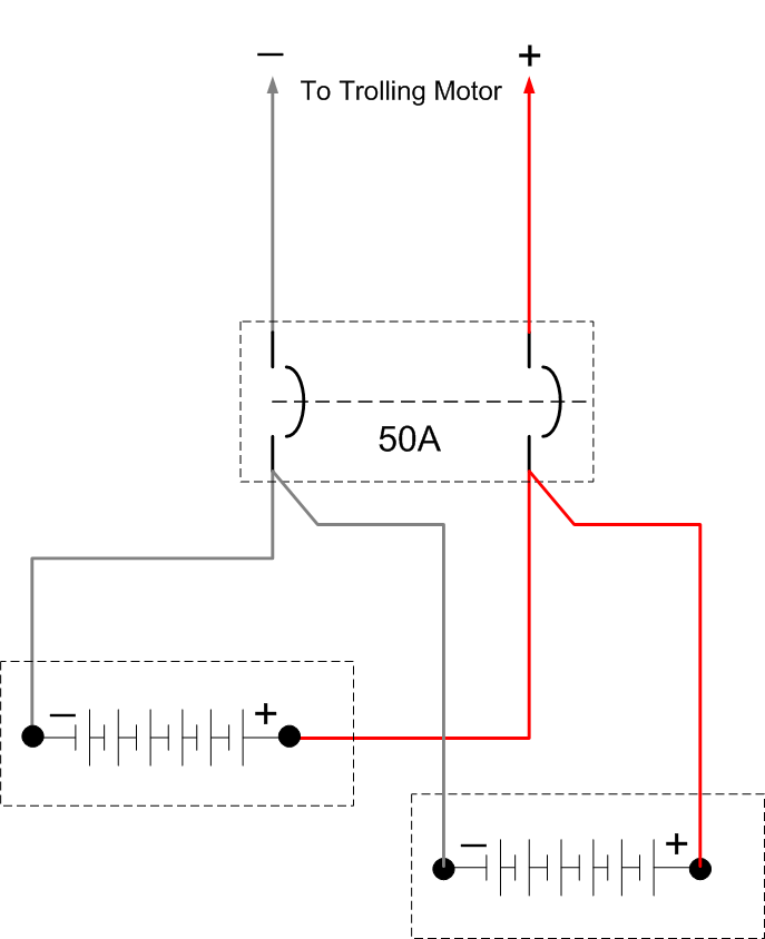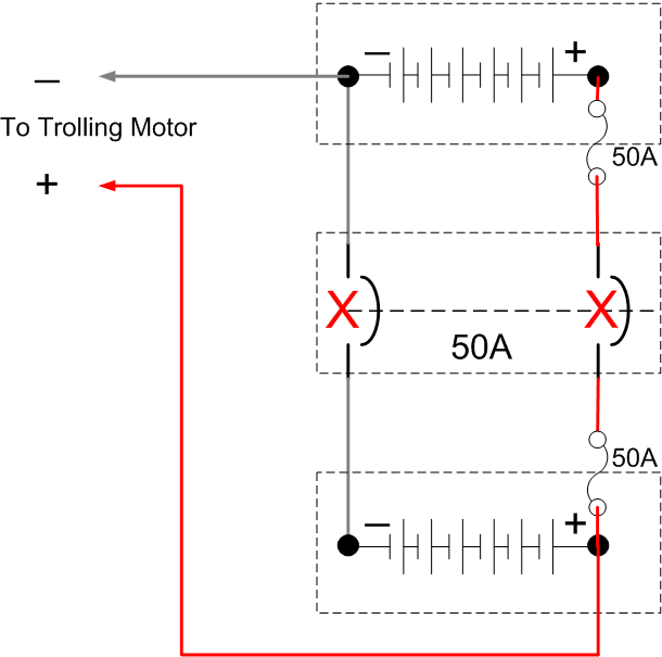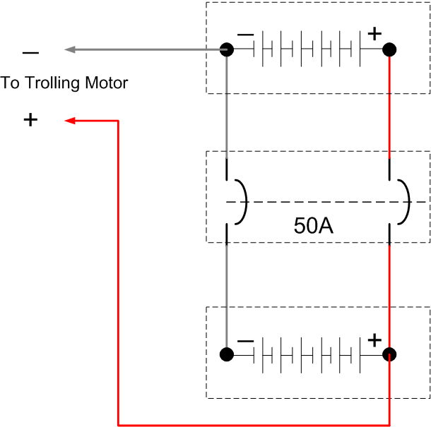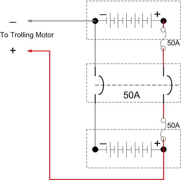 Posts: 2754 Location: Mauston, Wisconsin | Hi, I'd agree that drawing 1 is simpler. However, it doesn't show any circuit breaker or fuse protection..... very important for both your personal safety and fire protection. I've redrawn your first drawing using a 50A circuit breaker. This method offers complete protection for all of the cables. See drawing1 below. It's also the least expensive to implement. In drawing2 below, I redrew your second drawing and inserted a 50A CB where you had your terminal block. This will work and the cables between the CB and trolling motor are protected. . However the cables between the CB and the batteries are not protected. Therefore drawing3 shows fuses added at the positive battery terminals to protect the battery cables, if the battery cables are very long. No! I wouldn't just use fuses and replace the CB with a terminal block, i.e., you would have 100A applied to the trolling motor battery cables (50A from each battery). I used 50A as that is most common for trolling motors- check you user/installation manual, or the ampere rating marked on the motor itself. Again my personal recommendation would be my drawing1. If the distance between the batteries and the CB are longer than a couple of feet, you might want to add fuses at the battery terminals, i.e., same as drawing3. See drawing4. Good luck. Al Edited by ESOX Maniac 4/27/2008 11:12 AM Attachments ---------------- Drawing1.gif (12KB - 224 downloads) Drawing2.gif (14KB - 231 downloads) Drawing3.gif (16KB - 233 downloads) Drawing4.gif (14KB - 251 downloads) | ||