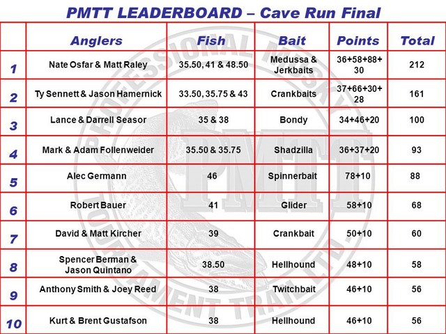 Posts: 32955 Location: Rhinelander, Wisconsin | The images of the fish caught and anglers holding team numbers are in the Cave Run 1&2 galleries. Here is the PMTT link for the Cave results: http://www.promusky.com/results/2013/13CR.htm | ||