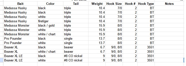 Posts: 433 Location: MN | I keep an inventory spreadsheet organized by category with details about color, weight, hook size, etc. Helps to keep track of everything, including hooks for spares. When it is all laid out in front of you, it's easier to see where you might have extras or be missing. You can also see if you have a bunch of money tied up in items that are not catching you fish. Attachments ---------------- spreadsheet example.jpg (89KB - 29 downloads) | ||