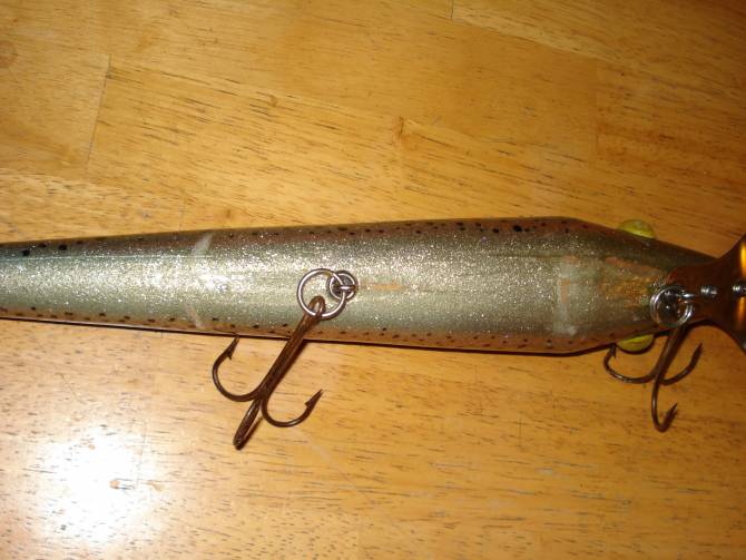 This lure has been used and could use some help with the clear coat,there is some paint missing from the hook swings- I applied epoxy to the paint cracks, but did not refinish the whole thing - either way its a one of a kind lure that was featured in a International magazine and I figure to the right person - it must be worth something!