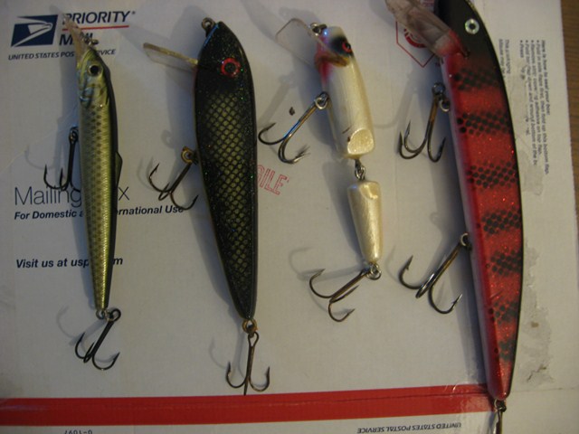 Posts: 605 Location: Marshfield, WI | Most baits have light use or are new. Some of the bucktails have been used a bit more and have some wear on the blades. Shipping is extra, $3-4 if I can ship first class, $6 if I can't. Pic 1-3. Marabou bucktails and one flashabou, all double 10s. $10 each Flashabou double 10 sold pic 4 Miss creeper(far left) $15 Topper stopper $11 Mag viper $14 baby doc $8 pic 5 Rumbler $11 (missing one eye) Stan Durst Custom Dancin raider $13 unknown $3 pic 6 One eye willy sold NJB jerkbait $10 bobbie $10 each pic 7 green glider sold Magic Maker sold custom jerko $14 6" timberwolf sold 8" timberwolf SOLD pic 8 Timberwolf sold Twisted sucker sold 3 squirkos sold pic 9 gold crankbait $4 black crank $4 white crank $12 10" Jake $11 (Tip of lip bent to resemble 9" grandma) pic 10 bigfoot depth raider $10 big fork crank $10 Wiley Sold Hoosier bait $17 (This bait is made to mimic a creek chub darter. It is much better trolled because it darts back and forth in a erratic manner.) pic 11 6" suzy suckers $5 each 9" suzy sucker $9 pic 12 9" curly sue $9 11" curly sue $13 pic 13 walleye jimmy(missing tip on tail) $5 cisco jimmy $10 eels all sold Edited by k-bob 4/30/2013 10:24 PM Attachments ---------------- 1.JPG (57KB - 101 downloads) 2.JPG (62KB - 109 downloads) 3.JPG (48KB - 124 downloads) 4.JPG (63KB - 99 downloads) 5.JPG (45KB - 106 downloads) 6.JPG (49KB - 108 downloads) 7.JPG (55KB - 107 downloads) 8.JPG (62KB - 99 downloads) 9.JPG (60KB - 99 downloads) 99.JPG (57KB - 99 downloads) 999.JPG (48KB - 108 downloads) 9999.JPG (47KB - 103 downloads) 99999.JPG (57KB - 106 downloads) | ||