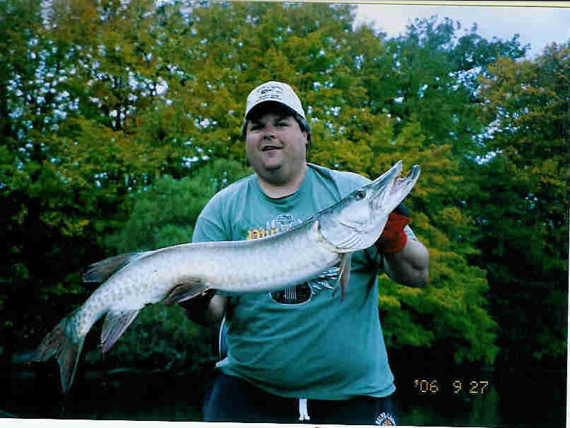 Location: Athens, Ohio | Sorry to keep y'all waiting. I promised to keep updates, but when we got to papa Joe's he'd given his work computer back for an upgrade so we were without internet all week. Ace, you da man. Now, I thought you said 47 with a slump in the middel so that's what's on my MI form. As many of you know, I'm not a quarter inch fisherman, anyway. It was a #*^@ big fish, way heavy. Photos to follow shortly, I'm getting a roll developed now and then I'll do ssome scanning. I was sick as a dog all morning with a fever and broncitis. I was glad Ace was willing to fish in such awful conditions. The fish was so heavy and I was so weak, I sat down for the photo. Not my best work but it was the best we both could manage. Papa Joe put me on a three fish day last Wednesday, with a 45, a 40, and one I didn't measure but somewhere in the mid thirty range. Treats tried his best to get me a Tonka fish, I had one follow and he had one early on his birthday, then a couple more good strikes. We had a blast seeing him, PK, Jonesi, and Papa J during our trip. more later, just catching up on laundry and e-mail now. m | ||