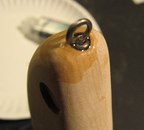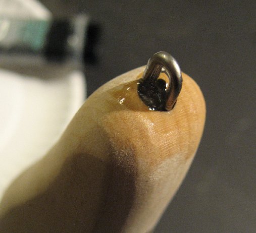 Posts: 388 | To lock the wire in place, I start by exposing the nose loop and filling the 1/4" bore with 5 min epoxy using a tooth pick to pump it into the cavity. The nose loop is pushed into the epoxy allowing it to flow around the wire loops and eventually locking the wire into the wood much like screw threads. I then flip over and fill the tail loop 1/4" bore with epoxy. The epoxy flows around the wire locking the tail end in place as well. Belly loops are done the same way. Some light palm sanding cleans up any excess epoxy. Epoxy does not actually bond to the wire (it is too smooth), but by allowing it to flow around the wire loops and bonding into the wood grain it all locks into place as well as sealing up the internals of the lure. Lead holes are also filled with epoxy to contour to the original profile of the lure. Edited by Yake Bait 3/10/2009 8:56 PM Attachments ---------------- IMG_1261b.JPG (39KB - 463 downloads) IMG_1262b.JPG (37KB - 395 downloads) IMG_1263b.JPG (36KB - 430 downloads) IMG_1264b.JPG (53KB - 402 downloads) | ||