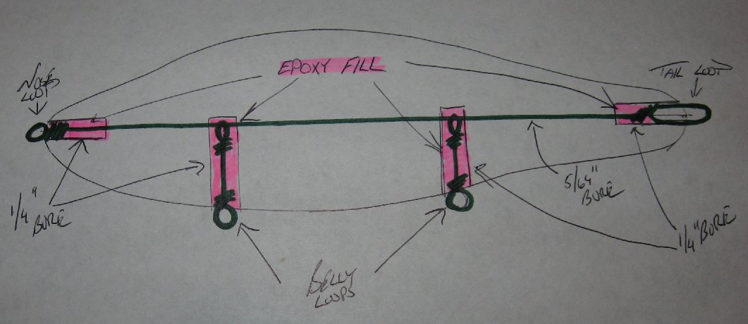Posts: 388 | Shane, First I make the tail loop and thread the straight end throug the lure. The tail loop can be pushed in flush to the end of the lure through the 1/4" bore giving enought room to make a loop on the nose end. Nose end gets filled with epoxy then is pushed back in before the epoxy sets. Tail loop and belly loops then get filled with epoxy. Once set, the epoxy bridges between the inside end of the wire loops and the step between 1/4" and 5/64" bores. The strength comes from the compression between the wire loops and step in bore (wire cannot be pulled through). Hopefully the attached drawing helps to illustrate. Attachments ---------------- IMG_1268b.JPG (64KB - 350 downloads) | ||