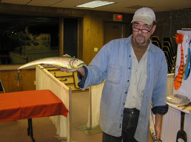 | Blair Harrington with his No Box Muskie Lures. these baits had amazing paintjobs, true works of art. he reports being able to troll his largest version (almost 24") up to 8mph, and up to as fast as 12mph for his smaller lures before they start taking line out. big trolling bait fans take notice! Attachments ---------------- LXShow 014.jpg (91KB - 151 downloads) LXShow 012.jpg (101KB - 162 downloads) | ||||||