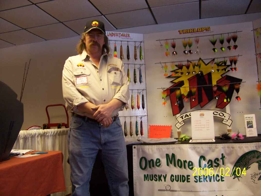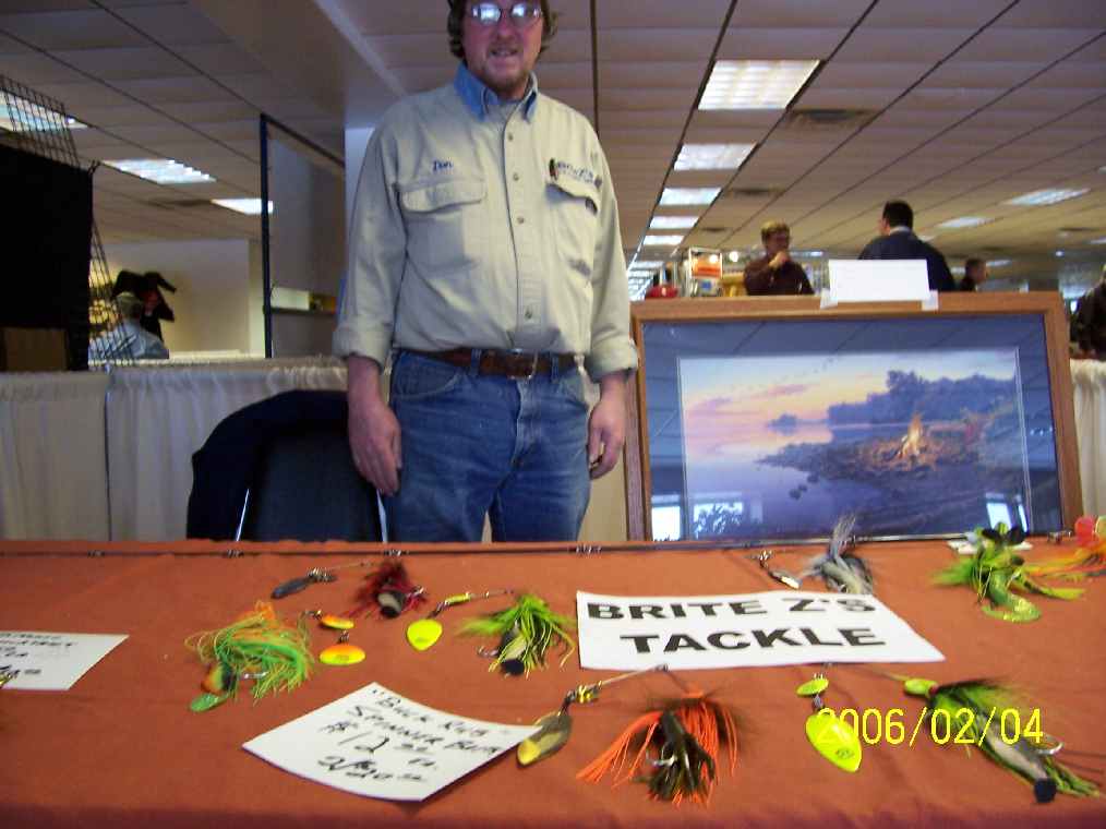 | Tom Riedel of Musky Madness Baits. it was tough getting him to be in the picture...trust me when i say that he does smile when you talk to him! nice selection of bucktails and spinnerbaits, a cranking surface lure with an "old school" leather tail, and a great looking globe (lower right of pic) made on 0.92 wire with a square insert to really clank as it spins. Attachments ---------------- LXShow 019.jpg (122KB - 171 downloads) | ||||||