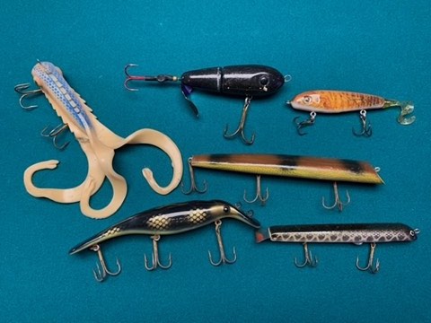 $20 Wood Jerk bait <- 9" long. Hooks a little rusty. No clue who made this - It's kind of wades Wobbler -esque It does have a weight in the bottom that is or looks original to the bait. OLDIE But a goodie - Wall hanger? - 60" class fish catcher?