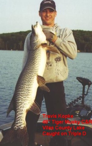 Posts: 1906 Location: Oconto Falls, WI | Here’s a monster caught in another Vilas Cty lake with naturally occurring Tigers. This lake is a cisco based lake with tanic, yet clear colored water. Lake had been stocked in the past with muskies, and those “stocker” fish usually have a greenish hue coloration to them. The “native” fish in the lake though have a brown coloration to them. The coloration of this little guy is typical in most small tiger muskies I have seen in any lake. Attachments ---------------- Hailey_1st_musky.jpg (87KB - 389 downloads) | ||