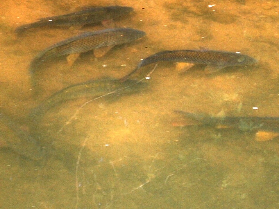 Some kind of carp spawning, but I don't think they are common carp, I am suspicious, it is some kind of rough fish, with carp and suckers coming on the honeymoon for free eggs. Note one of the companion fish and the first "tiger carp"