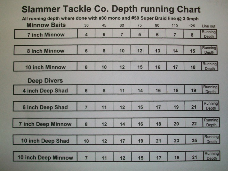 I run #30 mono or #50 Masterbraid when putting the chart together. A larger dia. line will make the baits run shallower where a smaller dia. line will get more depth. With #20 mono or #35 braid you can get a 7" deep minnow down 24 feet with 120 feet of line out. I have ran #30 wire and could get the same depth with 85 feet back.