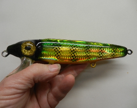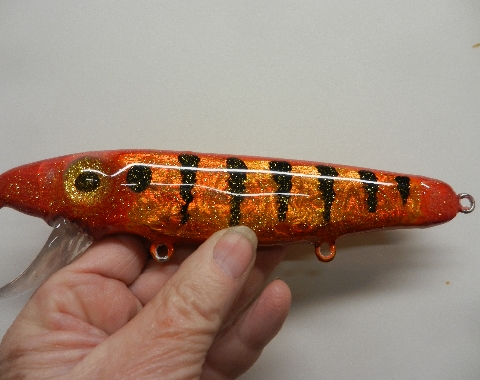 These are 7" resin lures painted on blanks obtained from Mike Richardson procured years ago when I first started doing lure work. He and James Haworth (Tackle Industries) were kind enough to make some blanks available to Basement Baits enthusiasts at a time when most blanks available were bass sized. Thank you gentlemen! The first picture shows Mike's blank - 7", resin, through wired, unique curved plastic lip. Blanks weigh about 1.5 ounces, after paint/epoxy/siding around 2.5 ounces. The other pictures are after paint/lacquer and epoxy.
