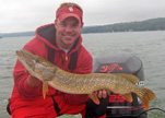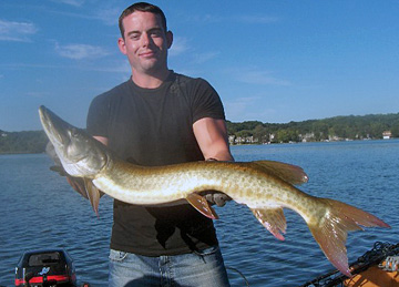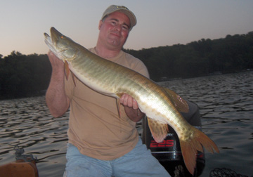 Posts: 2691 Location: Pewaukee, Wisconsin | Ok, here is the recent report on Pewaukee Lake. Sorry for the lack of reports here but my website is always just one click away. I try to update it every couple weeks or more. Water temps on Pewaukee Lake have been just around the danger zone. The last week of July had the water cooking in the 82 to 83 degree range. I was doing my best to reschedule the guide dates during this high water temps. Most eveyone didn't have a problem with it and got alternate dates for the ones I had to cancel. It's the 7th of August and I am still waiting for the rcent rain to cool the lake down under the 80 degree mark. Thursday 8/9 calls for rain and cooler temps so this might be the break we are looking for. I have heard of multiple muskies floating dead in the past week or two. I personally know of a 38 and 39 that are floating around for everyone to see what excessive heat will do to released muskies. Delayed mortality is huge during this heat. Please respect the resource. I hear some other guides are still fishing but all anyone can control is themselves. I am looking forward to getting back out soon, it's killing me. The action before the heat was outstanding. Multiple fish nites with multi species being common. Muskies, northern pike, walleyes, and bass were all active. Trolling was the best for numbers with some action on the weedlines for the casting fishermen. The nite bite, early and late in the day was best for the people working the weedlines and points. My clients have been sticking lots of fish every day up to this heat wave that set in at the end of July while I was up at Mille Lac's catching some huge fish casting after dark. Our annual week long trip to Mille Lac's was awsome. My first fish was a very solid 50.25-inch muskie that came 3 hours into our trip. My partner Randy scored the next fish and it went 49-inches to start the week. Great trip for all of us. You got to like that pond. Anyway, back to Pewaukee. With the water temps in the 80 to 82 degree range the fish will still be very active. Please respect the resource and let the water cool some. Two to three degrees is a huge drop and the fish will still be there for everyone to catch. Recently the lake is not getting lots of pressure because the word is out on how many fish are dieing while being released. Water releases are the best at this time of high water temps. No net, just reach down and cut or unhook the fish at boatside. This is the best for the fish. The patterns I work are suspended fish and structure fish at this time of the season. Look for the concentrations of bait and the preditors will be close by. Crank baits have worked the best trolled through the schools of gills, crappies and baby perch. Colors like firetiger, white, green, orange and even red have produced very well. Try to match the bait fish your fishing around. If it's crappies stacked up go with white and black, gills and perch I would go darker. I will toss up some pictures from the early July trips on Pewaukee Lake and some from just before the water got to hot. Edited by Mikes Extreme 8/7/2007 9:04 PM Attachments ---------------- 41tim2x1.jpg (41KB - 208 downloads) 40skijoe2x1.jpg (40KB - 180 downloads) riley40pike2x1.jpg (47KB - 183 downloads) riley38ski2x1.jpg (47KB - 189 downloads) 40july2x1.jpg (45KB - 196 downloads) 36tom2x1.jpg (45KB - 185 downloads) 37shawn2x1.jpg (41KB - 187 downloads) 39johnsboy2x1.jpg (44KB - 184 downloads) 35joe2x1.jpg (44KB - 173 downloads) 33joe2x1.jpg (40KB - 202 downloads) 37_5matt1x2.jpg (46KB - 162 downloads) steve2x1.jpg (37KB - 212 downloads) 40chris2x1.jpg (43KB - 173 downloads) 7-9eyes2x1.jpg (38KB - 180 downloads) kens22eye2x1.jpg (40KB - 178 downloads) matts2x1.jpg (41KB - 196 downloads) julyski1x2.jpg (46KB - 186 downloads) | ||
