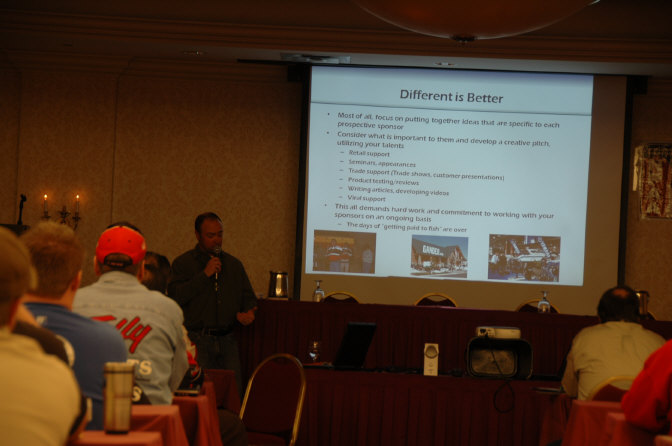 Posts: 32958 Location: Rhinelander, Wisconsin | The meeting was very informative, and it's now true that Muskie anglers can join. If you are a competitive angler or a full time guide, you will definitely benefit. Looks like I'll be getting my old NPAA Number 189 back! From the discussion yesterday, a new member will pay $110.00, and will, after renewing membership the second year, have the right to vote. Al Lindner addressed the group yesterday, and talked 'out of the box' from the start. Fascinating address, and inspirational to anyone looking for or already holding down a fishing/marine/promotional/sales/etc position. The NPAA supports professional anglers encouraging exemplary professionalism and supporting our efforts with our sponsors, showcases the accomplishments in press releases and on the NPAA website (www.npaa.net), supports competitive angling for all freshwater fish, supports and actively runs youth fishing events and seminars, supports Angler Young Angler events, (http://www.angleryoungangler.ca/) and much much more. Serious discounts are available from many companies to NPAA members all year long, and REALLY nice discounts are extended during the annual Conference. There are many potential fishing industry sponsors out there who look for that NPAA number when considering you as a team member. The available advice and training is invaluable, and the fee can be recovered in just a few purchases with the deep discounts available. The opportunity to rub shoulders with some of the top pros in the US and Canada and their sponsors doesn't hurt, either. The NPAA also is looking to grow as an advocacy group, working to protect our unfettered access to the waters we fish, our very privilege to fish and to fish competitively, and much more. In order to accomplish those goals, the NPAA needs to grow. I don't think there could be a better watchdog than the folks out there actually on the water full time. As of the end of this week, I'll be sporting the NPAA 189 Number on my boat and truck. Attachments ---------------- DSC_0056.JPG (56KB - 137 downloads) DSC_0052.JPG (55KB - 132 downloads) DSC_0041.JPG (110KB - 139 downloads) DSC_0050.JPG (76KB - 138 downloads) | ||