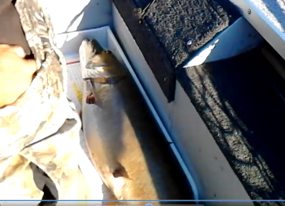 Posts: 1150 Location: Minnesota. | Jimbo - 10/19/2015 1:41 PM OK we had a video going during fight. I didn't take picture on bump board (dumb mistake) but I took these 2 screen shots off my computer. The tail on the top was broken up a bit but the bottom portion of the tail just made it to 50". Yes I know you can't see the whole fish on the bump board but this will have to do for Todd. :) Looks like a 49 15/16" inch'er from where I sit Jimmy..... Kidding....Beautiful, healthy rascal! Jeremy. | ||