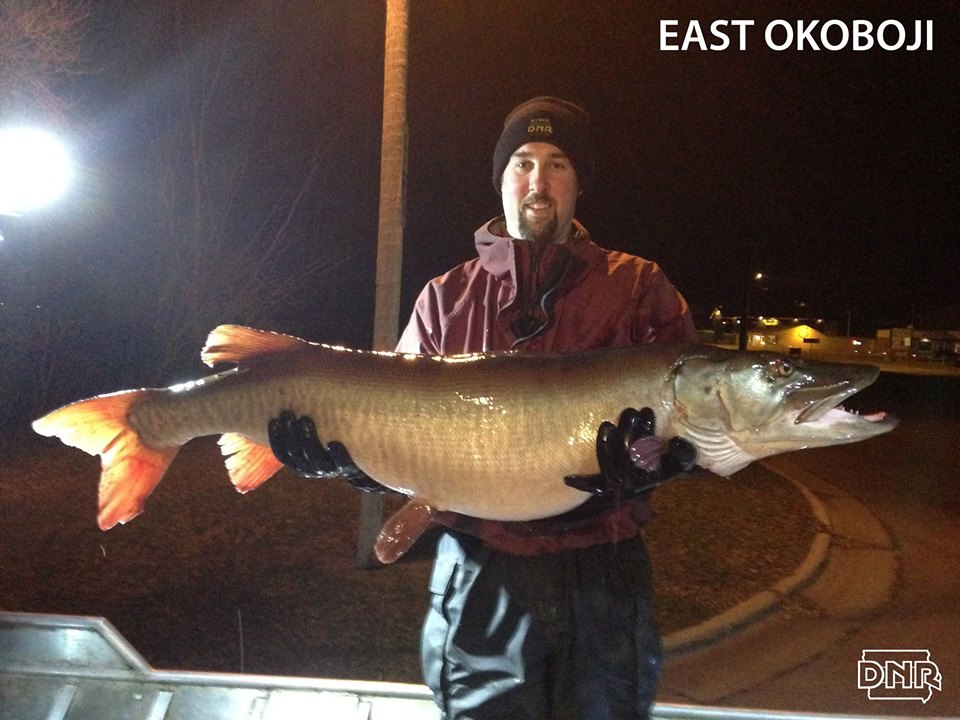 Iowa Department of Natural Resources The fish in the photo was 50.9 inches long. It produced 5.5 lbs of eggs for the hatchery. This muskies was only 11 years old and was hatched at the Spirit Lake Fish Hatchery in 2003. The maximum girth, measured around the fish, was 24.2 inches. It looks like this fish has quite a bit of growth potential. Many of the female muskies in these lakes survive into their mid to late teens.