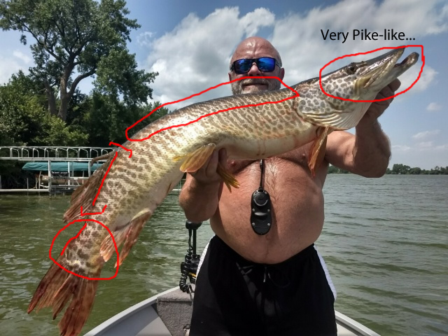 Posts: 1636 | The reason I believe it may be a Tiger Muskie is the shape of the head... and the back portion of the body. The shape of the head and the tail resemble what you usually only see in Tiger Muskies. The width between the bottom and top of the fin is also very tall... along with what can be consider a larger than normal dorsal-fin. Pure Muskies are simply shaped, differently. | ||
