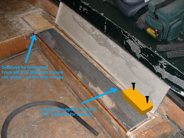Posts: 317 Location: Grafton, WI | Setme31, The gas tank is in the far back of the boat behind the casting deck. I installed a 13 built in tank. You can see the filler and vent in the picture. The flush livewell was done by creating the same thing as the side that has the rod locker. If your boat is the same, you have a 3/4" drop on the side with the rod locker. I added 3/4" plywood to the livewell side where it also drops down at the front deck. Once I knew where the lid was going to go, I cut the plywood so the lid would fit... then glued and screwed it down, and fiberglassed it. The rod locker was done basically the same, only with that I cut a new hole where the lid would go, added new 3/4 plywood to the area that was not needed, and mounted the supports to the bottom side. I was able to fabricate a drain lip around the rod box from the old lip around it. In the picture, it is supposed to show a cutout of the way the plywood was mounted as a support. - everything was fiberglassed prior to carpet. Hope I didn't confuse you too much. If you want more pictures, or chat - shoot me an e-mail - [email protected] Attachments ---------------- livewell_1.jpg (73KB - 522 downloads) livewell_2.jpg (61KB - 546 downloads) rod_locker.jpg (77KB - 408 downloads) rear_1.jpg (81KB - 633 downloads) | ||