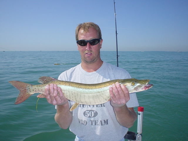 Posts: 1137 Location: Holly, MI | Gander Mt Guide - 6/9/2004 9:57 AM Lobi, Did you catch that fish down in Key West??? That thing looks like a salt water critter. That is the Great Lakes Muskie. The younger ones have more spots. They are only in Lake St Clair, Indian River (Michigan), and the St Lawrence River to my knowledge. Here is a smaller one with bright colors.. Attachments ---------------- Fishing 007.jpg (150KB - 111 downloads) | ||