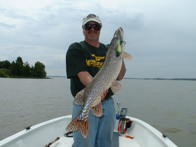 Posts: 32958 Location: Rhinelander, Wisconsin | Well, the weather was a bit weird today, to say the least. We woke to a steady rain and wind, and hit the water despite the fact it was miserable. Nothing going in the favorite haunts, so we came in and went to Dryden to stock up for next week. We hit the water early afternoon to a South wind, pretty strong and gusty, and clearing skies. Water temps were upper 60's. We headed for new water, as most of the Milk Run is North shore, and just started fishing when a cloud positioned itself over our heads and cut loose with the most ridiculous rain I have ever been fishing in. That lasted about 1/2 hour, and the skies cleared again with an even stronger SW wind. I opted for new water, as the Milk Run was definitrely out due to very rough water, and guess what, less than an hour later, the skies were clear of any clouds and the wind went dead. We headed for the Hog pen, and tossed topwater and bucktails. Sue had a real dandy blast her topwater, roll it over itself forward, and swim back into the weeds. I was looking at her bait when the fish hit, it was pretty cool. That was the only active muskie we moved all day, but was worth the trip to see it up close and personal. We will be back there tomorrow, wind allowing. Fish of that quality are the reason I keep pounding this murky old water! Big Pike were not as regular today until 8 PM when the wind was down. We got 8 between 26" and 34" in less than a half hour fishing one of my favorite muskie spots, all on topwater. Tomorrow the MuskieFIRST crew arrives, so reports will be from us all from Saturday on. I have to get back and work a couple days, but should be back up mid week. | ||