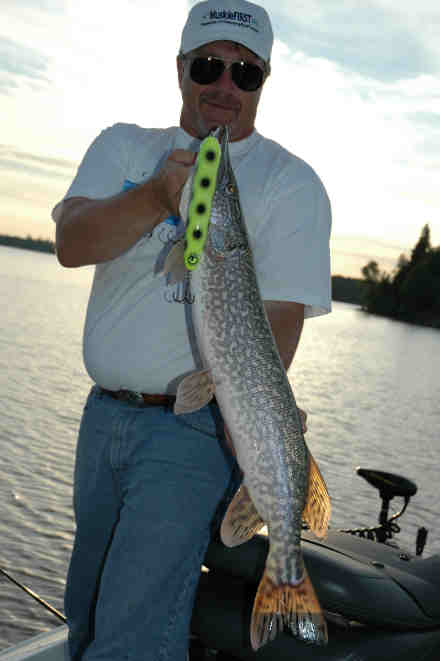 Posts: 32959 Location: Rhinelander, Wisconsin | Another great day on the Goon, with multiple big pike and a total of 4 muskies in camp. The Pepto Castor was HOT on the big Pike this afternoon ( Sue and I got out on the water at noon, no hurry when the sun sets completly at 10:30) and a Violent Strike spinnerbait scored me a very nice Muskie. We fished with Merv tonight, he had his rig out of the water ready to leave tomorrow. He jumped in the rig with Sue and I and scored several nice pike and rolled a nice muskie all on a Black/Pink Violent Strike Magnum. Attachments ---------------- Muskie2.jpg (17KB - 135 downloads) DSC_0143.JPG (68KB - 152 downloads) | ||