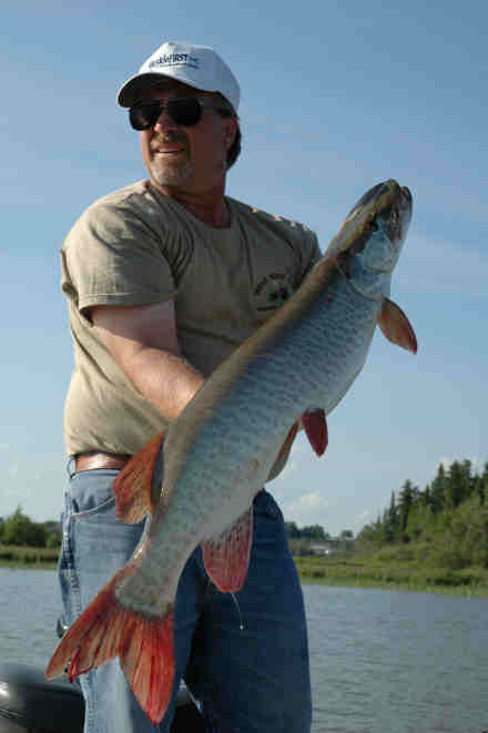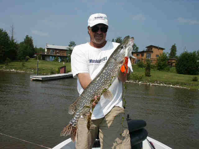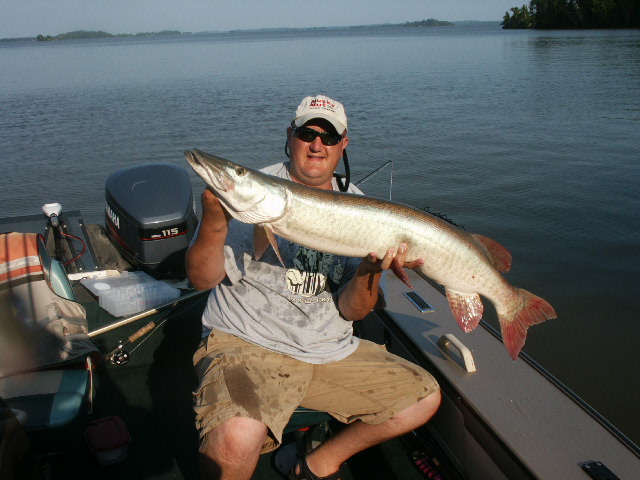 Posts: 32959 Location: Rhinelander, Wisconsin | Baldy got a 44, tommyv got a 36, I got 2 low 40's and a 42" pike, Slamr got a 35 and 40" pike (Nikki, Slamr, and I got out this evening, moved 7 muskies in one small area including a supertanker, got the 42 and the Pike) and there were several other fish caught I don't have here yet. Hopefully, this is an omen for the rest of the trip, the fish were on during the afternoon and evening. Jack and I got a limit of 'eyes this morning from 16 to 20", had a great time. Attachments ---------------- PICT0041.JPG (197KB - 136 downloads) PICT0043.JPG (169KB - 137 downloads) Slamr's 35.jpg (19KB - 141 downloads) Slamr's 40.jpg (16KB - 144 downloads) Worrall40s2.jpg (19KB - 141 downloads) | ||