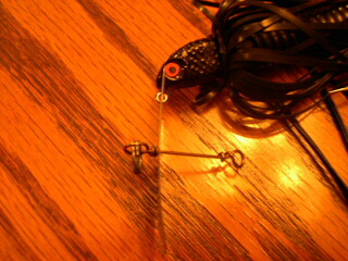 Posts: 476 Location: WI | We were still working on your concept or something similar of connecting the jig head to the ring that we made on the underside of the metal lip. We were thinking about seven strand wire or maybe even flourocarbon. I'm going to try your 3 split ring version as well. I had the original snap that came on the lure open up three times on me, so this was a big concern as well. GotOne Edited by GOTONE 3/19/2006 11:05 AM | ||