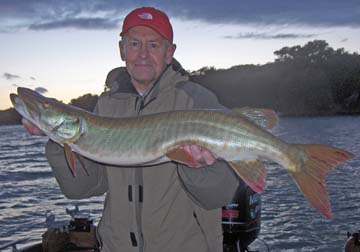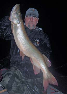 Posts: 2691 Location: Pewaukee, Wisconsin | Ya, we got a 37-incher tonight on a Headbanger top water bait. Last night we had 3 hits on three different top water baits without a hook up but I did get to catch a low thirtys muskie on a bucktail at boat side. I had a real nice 45 to 47-inch muskie eat that same bucktail tonight on the first turn of my figure 8. She was real thick across the shoulders and would have been a great client fish if the hand-off would have worked out. As it was the fish shook the hooks and only left a memory. I can still see her inhail the bait at boat side, I set the hooks hard twice and she started to strip drag, perfect time to hand off the rod to my client. Oh well, there is always tomarrow. We also lost a fish as we were setting up for a trolling pass just after we got out tonight. I had a couple rods set when one went off. My client Billi got the rod and she held on while the fish was battling to get free. Somehow it came off before it got to the net. One for 3 tonight. 3 for 3 would have been better. Thats fishing. | ||