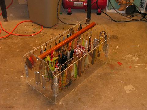Posts: 79 Location: michigan | Yeah I liked the origanal box to, just never new how to get one. So I got the brain working and wa la. All material came from Home Depot you could get it from Lowes as well. Basically 1/4" thick plexy 10-24 screws/nuts 1 x 1 x 48 angle Aluminum 1/16 thk. A dowel rod for handle. I used 5" pieces of angle with two holes drilled in each side. Basically 32 fasteners and two brass wood screws for the handle. Dont make the mistake i made drilling holes. Start with a drill half the size of the thru hole, then finish drill the dia. of the thru hole of the size of the screw. Also factor in length of hooks that hand so a lure 10" long better be 14" high sides. Also no bottom. Its nice when a lure falls in there you just lift the box and hang it back up. Edited by muskiehound 1/8/2007 2:10 PM | ||