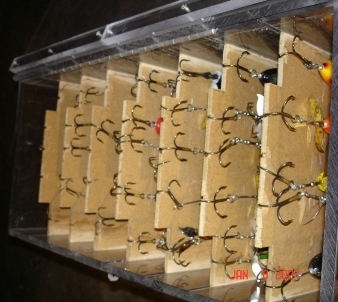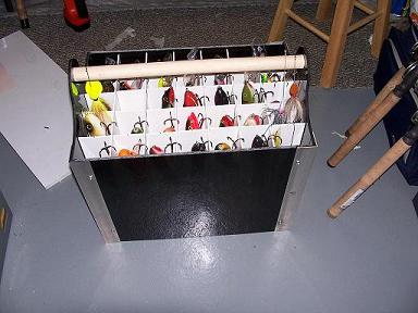 Posts: 79 Location: michigan | I now this all about lures but they got to go somewhere. Anyway I saw a box like this at a lure swap and liked it. So I studied it and came up with my own. Its 12" x 24" with 12" hangers (diffenitely need to be taller in the middle). Right know its holding 49 lures with more room for others. Jim Attachments ---------------- houndsbox.JPG (30KB - 227 downloads) | ||