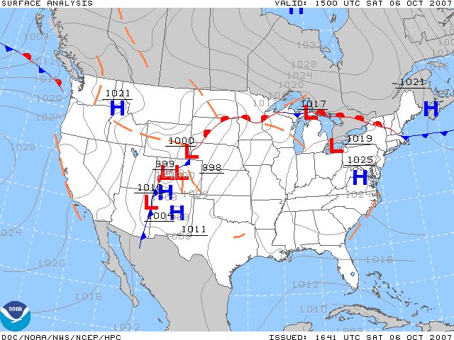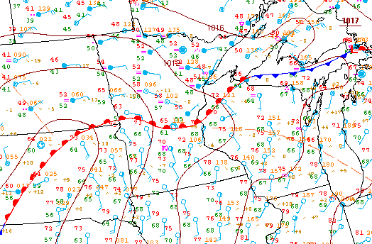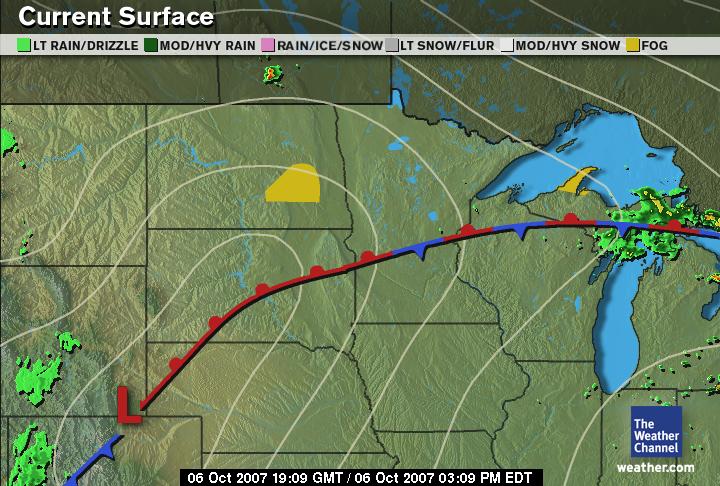 Posts: 676 Location: Wisconsin | The thunderstorms were caused by warm moist air riding up over the warm front. As warm air is moving from the south it rides up the cooler air and clouds form and thunderstorms. This is no relation to the low pressure center to the east. The low has nothing to do with the front. The fish were active during a reduction in light due to cloud cover. The storms caused that and then when the cells moved east, the fish were negative again. Probably some lightning can cause fish to be skittish as well after they push through. Since the pressure was stable the entire last 24 hours, stating that pressure has a role is defunked. Edited by Muskiemetal 10/6/2007 2:42 PM | ||