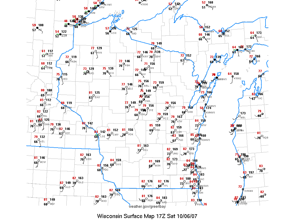 Posts: 676 Location: Wisconsin | 3 PM 29.97 (1014) S 12 2 PM 29.98 (1015) S 7 1 PM 29.99 (1015) S 3 Noon 29.99 (1015) S 5 11 AM 30 (1015) SSW 7 mist 10 AM 29.97 (1014) SE 5 light rain with thunder; mist 9 AM 30.01 (1016) SSW 10 8 AM 29.97 (1014) SSW 7 light rain; mist 7 AM 29.98 (1015) S 5 mist 6 AM 29.99 (1015) S 3 mist 5 AM 29.99 (1015) SSW 6 mist 4 AM 29.99 (1015) SW 3 light rain; mist 3 AM 29.99 (1015) SW 8 2 AM 29.98 (1015) SE 7 light rain with thunder; mist 1 AM 29.99 (1015) S 7 thunder in the vicinity Midnight 30.04 (1017) SE 5 mist 11 PM 30.03 (1016) ESE 3 mist 10 PM 30.03 (1016) SE 6 9 PM 30.03 (1016) SE 7 8 PM 30.03 (1016) SE 7 light rain with thunder; mist 7 PM 30.02 (1016) E 6 6 PM 30.02 (1016) ESE 7 5 PM 30.03 (1016) E 6 4 PM 30.04 (1017) E 7 light rain This is the last 24 hours in RHI. No change in pressure. I calculated the difference of 4 millibars of pressure per square inch and 4 millibars is .5 ounces per square inch of surface. This would be applied to the surface of a lake. I don't think a fish would sense that. The Low to the east is 1016 millibars and RHI is at 1015. So, 1/4 of 1/2 ounce of pressure change from the Low in Canada to Wiscosin. You can't say that pressure has anything to do with it..... Edited by Muskiemetal 10/6/2007 2:57 PM | ||