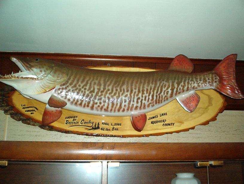 Posts: 176 Location: Tomahawk, WI | I've got a 49.75" Wisconsin green machine Repo. from Aquatic arts of Tomahawk, and a 49" tiger from Fittante. Thinking of getting a Repo. of a very beautifully barred 51" fish i caught 2 years ago. After that, all that is left is a Spotted and i will be done, will need to travel great distances for it. Mike | ||