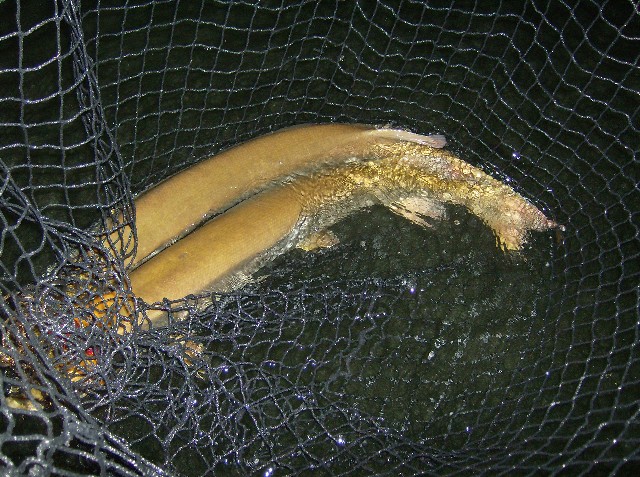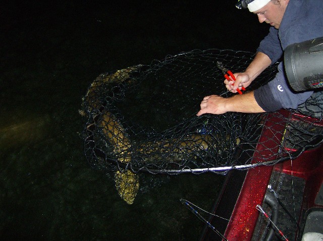 Posts: 785 | Thanks to some kind words from some gentleman on this board I thought I'd go ahead and create a separate thread on this. Last Thurs. night (8/14) I got to witness one of the coolest things in my fishing life. Around 11:00 I heard Kevin say something and I looked back just in time to see him haul off on a fish at boatside. As I'm watching this I see Karen who's standing between us set the hook on hers... it wasn't more than two seconds after the first one. So I'm watching them BOTH fight big fish in the dark and now I start to wonder how in the world I'm going to pull off this net job. After lots of thrashing Kevin says she's coming, so I start to go for his when karens comes up from under the boat and gets in the way. Long story short I scooped em' both up at the same time. We kinda hurried things because I didn't want to hurt the fish but I was pleased with the how the photos turned out. I would of liked to get a better one of them in the net together but it wasn't too bad. Anyways it ended up being both of there first 50"ers at the exact same time!! Kevins was 50 even on a cowgirl (shocker) and Karens was a 50.5"er on a nut buster. It's one time I can honestly say it was way cooler to watch than to do. Congrats to you both!! Attachments ---------------- workin.jpg (90KB - 101 downloads) twins50.jpg (145KB - 102 downloads) Kevins50.jpg (71KB - 103 downloads) Karens50.5.jpg (71KB - 101 downloads) | ||