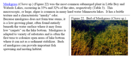 Posts: 335 Location: Minnesota | Curleytail - If I wanted to find chara in northern Minnesota, I would go to a musky spawning bay and look at the vegetation that is out there in about 3-5 feet of water. It will grow deeper but I know I would be able to see it plainly in the shallows. It forms a pretty dense mat in lots of places. I am not sure what it would look like at this time of year in those bays but if you get out there early in the year (before June 1), before all of the other vegetation gets too high you should be able to see huge areas of chara. | ||