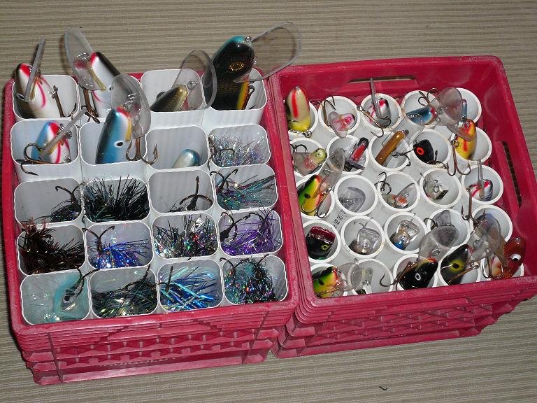 Posts: 11 | heres what i did for a tackle box, and it only cost about 20 bucks! you get an old milk crate and then get some pvc downspout for gutters and cut that down to size and put them in the milk crate. it works perfectly and will hold probably up to 40 or 50 baits. | ||