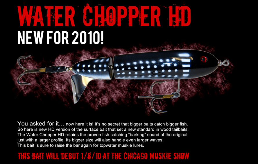 | New from Lee Lures Surface Baits is the long anticipated Water Chopper HD. I have worked on and off with this bait since 2005 and it is finally perfected. The hard part was keeping the same sound of the original Water Chopper, just with a bigger profile. This bait will perform at most any speed, in any chop, and will not roll! I will be making about 300 of these total this season. I have also stepped up production of last years debut of the Tidal Wave and have added some new colors. With many of reports of 50"+ fish, I thought I would make a few more this show season. As always I will have some new custom colored Water Choppers including White/Chart. Musky, Orange Musky, Natural Perch, Leopard Frog, and Firetiger Musky. I do not have pictures of all of these yet so you may have to wait till the show. I will also have new custom colors of Top H20's,Fish Stick HD's, and Hot Wings Creepers. Thanks for all of the positive feedback and sharing photos this last season. Lee Tauchen http://leetauchen.com | |||
