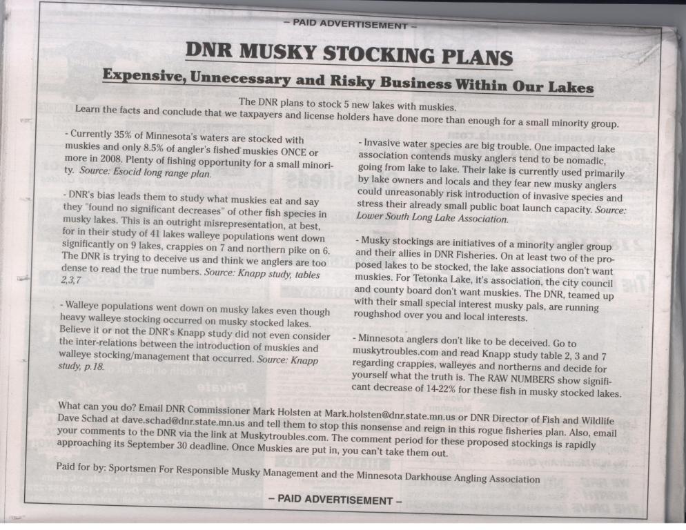 | The latest MN Outdoor News has a half page paid advertisement; as well as commentary accusing the MN DNR of fraud in their research as well as implying an unfair relationship with Muskie Anglers. This is no joke guys and gals, these people are out of control and will stop at nothing including compromising their own dignity to achieve their goal. Stopping Muskie stocking statewide. You can also write or call with your comments, Call MN DNR at 218-999-7819 or e-mail to [email protected] Edited by Muskiefool 9/17/2010 12:58 PM | |||