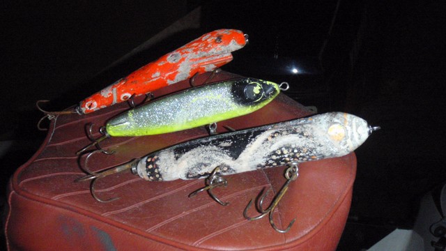 Posts: 4080 Location: Elko - Lake Vermilion | sworrall - 12/23/2010 9:25 AM Sam, Exactly. The lure footprint is so different from a Loon swimming around it's a different universe. Jerome, you need to toss topwater in black/orange, and black/yellow patterns up there some. Muskies will eat birds because they eat what moves, but loons are not on the regular menu, mostly because the feathers cause constipation and the 'farts'. Steve, do you mean something like these colors ?? Can you tell that I throw that Weagle a little bit...... A gift from Steve Jonesi at a swap meet in Chicago..... Black,Yellow, Orange, White, all good colors but action and noise (vibration) will cause fish to react more. Attachments ---------------- PC250179 (Copy).JPG (64KB - 963 downloads) | ||