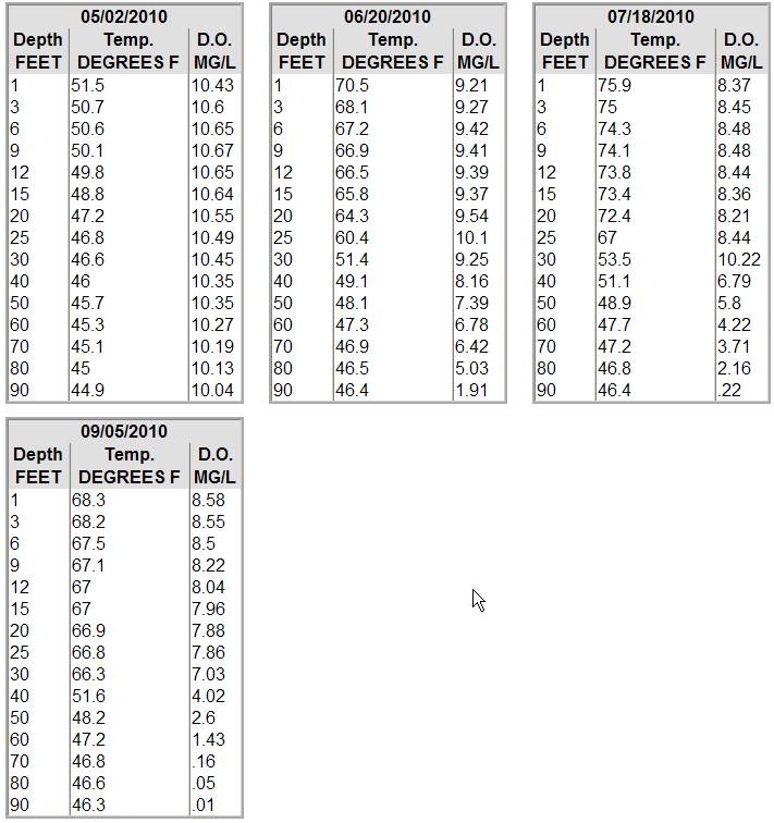 Posts: 2361 | CiscoKid - 3/19/2011 5:19 PM I could be wrong, but I wouldn't consider that a thermocline. There should be a greater temp difference than that I would think, but like I said I may be wrong. Look at the last profile of depth, temp, and DO in my previouse post. Clearly it indicates a thermocline between 30' and 40'. The July profile, as I mentioned earlier as well, clearly shows a thermo between 25' and 30'. This one also shows more than enough DO below thermo. The last profile (sept) does show typically of what people think about DO below thermo even though the reading below thermo does have enough DO (barely) for fish. After that the DO drops drastically. Sorry you think it should be different, but check the graph again, there is a 3.5 degree temp drop over 5 feet. That is what is left of the thermocline. The oxygen levels above and below are also notable, in that there is no mixing going on, and it is still stratified. Check above this and you will find a 1.7 degree drop in 45 feet. Check below and you will see a 3.6 degree drop in 20 feet. rapid temperature change per foot of drop identifies the thermocline clearly. Check the same graph in summer and you will see it much higher and much more clearly, but it is what it is. | ||