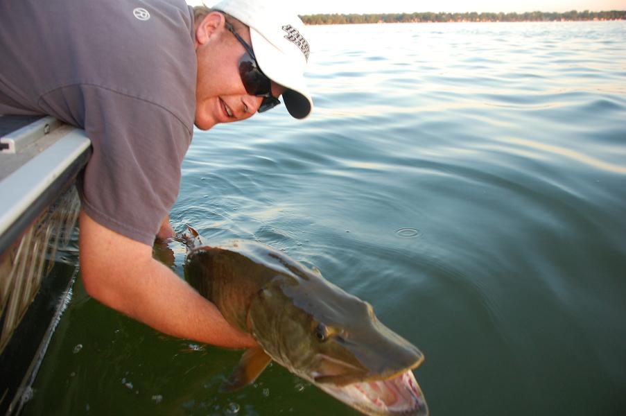 | Angles angles angles. If I've got the camera, I'm constantly taking pictures when someone boats one. Often, my favorites are when the guy thinks the photos are over and turns slightly to put the fish in the water. A broadside shot of a fish is OK and definitely has its place, but the ones that really capture your eye are ones that show the width of a fish's head or back (lots of Jerry Sondag's photos do a good job of this). Those are the ones that make you say WHOA aloud. Over the shoulder release shots are neat (I like the above one), but the famous Jack Burns release shots take the cake, IMO. A nice touch is when the person is looking at the fish vs. looking directly at the camera; sort of gives a sense of reverence and respect to the fish (see above release shot). Fill the frame and zoom with your feet if necessary. Action shots (hook sets, a rod doubled over while fighting a fish, a fish jumping, a fish following, etc.) are rare when muskie fishing and their elusiveness alone makes them supremely more interesting than a grip-and-grin shot. BTW, the above release shot is excellent. Without pixel peeping it appears tack sharp, has no background distractions, the eye is naturally led to the muskies eye and then to the angler, great lighting. Nice work. | |||