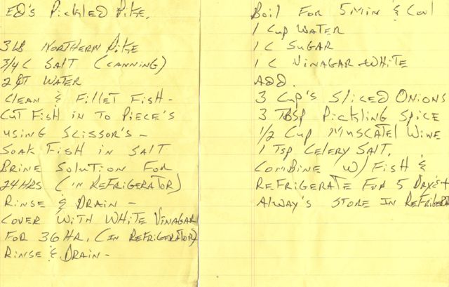 Posts: 2754 Location: Mauston, Wisconsin | No need for wanton waste of those hammer handles, if you really feel the population is out of control and the fish is legal length. Protecting the larger fish, both northern pike and muskies would also be a positive step forward. This is a great pickled fish recipe from a departed friend (Ed Barrett) RIP Ed! Every time I fish the Lemonweir River I think about Ed and all the good times we had, that's were his ashes were placed. This makes about 1 gallon. I use the gallon glass jars, e.g., the kind pickled pig's feet, turkey gizzard's, pickled egg's, etc. used to come in. I've kept mine tightly sealed for over a year, in the fridge of course. It still tasted like it was just made. Follow the instructions- its a no fail recipe. Have fun! Al Edited by ESOX Maniac 7/22/2013 7:56 AM Attachments ---------------- Ed's Pickled Pike-FB.jpg (45KB - 253 downloads) | ||