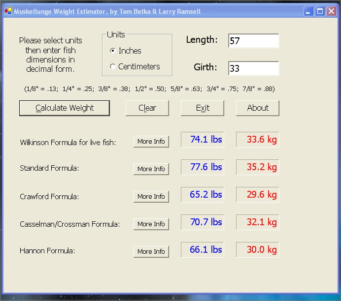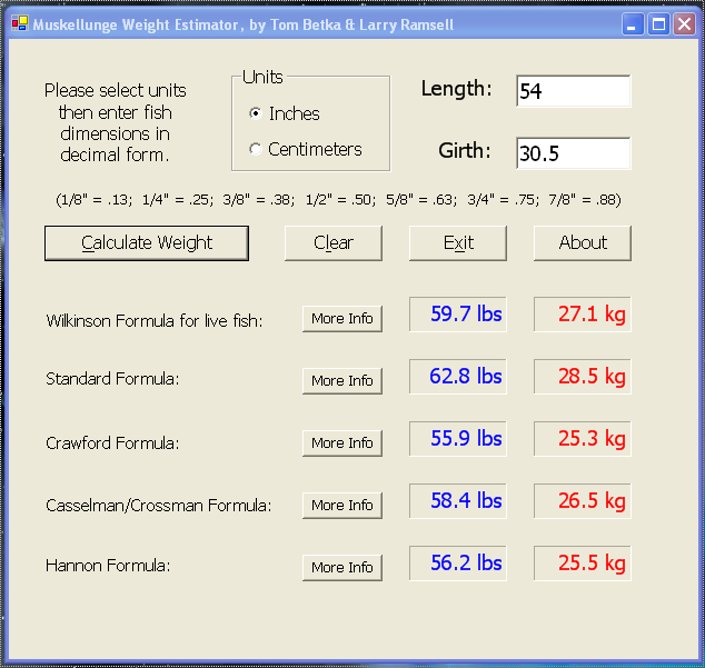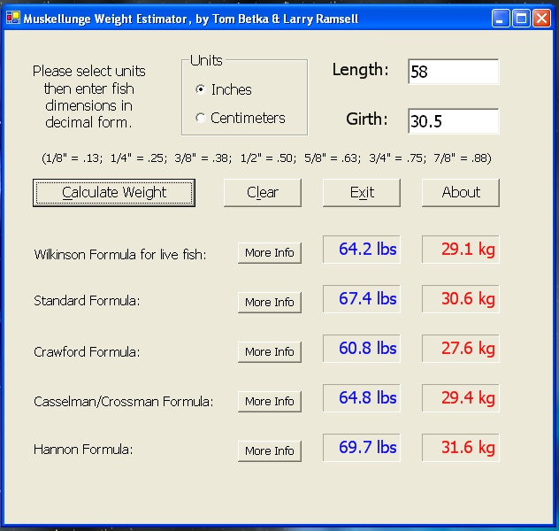 Location: Green Bay, WI | A 54" musky could in the 65-pound neighborhood, I suppose, given it's girth of course. Take a look at the screenshot of the output of my fish weight estimator program. I used 54x30.5", as I seem to recall seeing 30.5" listed for the girth. At this girth however, the major variations of the weight estimation formulae do not show it getting to 65 pounds. TB Edited by tcbetka 4/8/2011 1:05 PM Attachments ---------------- weights.jpg (263KB - 401 downloads) | ||