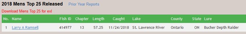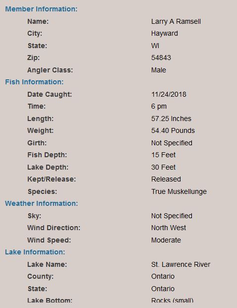 Posts: 1299 Location: Hayward, Wisconsin | lurenut: The oldest angler caught I know of is 29 years old. The oldest I know of was aged by the old scale method (very inaccurate in older fish and "underestimates age") was 33 years. More than likely it was a few years older than that. Very few however, live that long...kinda like a person over 100 years old. Got another "never ending" beauty to share. Bill Barber got a better photo of this massive 58 x 27 from the St. Lawrence River. Click on photo to see it all. Edited by Larry Ramsell 4/3/2014 10:28 PM Attachments ---------------- 58 x27 Bill Barber St. Lawrence River_crop.jpg (31KB - 572 downloads) | ||