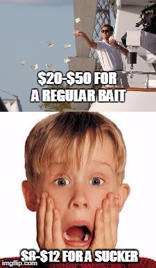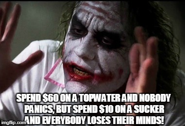 Location: Contrarian Island | yah I get a kick out of these threads every year, most guys have well into the 100s of baits that they have never caught a fish on...but b*tch about a 8 to 12 sucker... we spent about 140 bux in suckers last weekend...but also boated 6 fish with a 51" average... yah, don't buy suckers! keep buying 40 dollar bucktails, 50 dollar topwaters, 90 dollar cranks, and 150 dollar jerkbaits. real smart. Edited by BNelson 11/1/2017 9:56 AM | ||