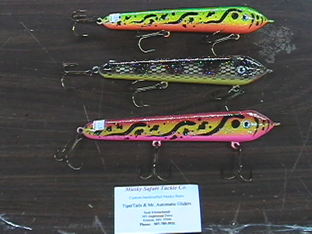 Posts: 32958 Location: Rhinelander, Wisconsin | Her are some pictures as promised! 1) Rollie and helens Custom DDD 2)Rollie and helens custom Musky Safari Automatic Gliders 3) Rollie and Helens Salmo Giant Giant Chubby (Real name. Sheesh!) Attachments ---------------- PANA0468.JPG (65KB - 205 downloads) PANA0464.JPG (73KB - 190 downloads) PANA0467.JPG (59KB - 184 downloads) | ||