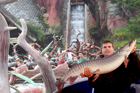 Posts: 188 Location: Madison, WI | That Disney's Splash Mountain is a muskie hot-spot comes as a suprise to many but to Goofy here it's the only place to fish. "Log rides are frequently overlooked and even more frequently improperly fished" says the Goofmeister. "Most people hop in a log and spend the entire ride looking for weedbeds that don't exist". His advice, fish the timber and be prepared to lose a lure or two, maybe even a rod, reel, trolling motor and "that little metal tab thingy above the prop on your outboard" (he's not called Goofy for no reason). Fishing fast is an understatement as most trips last less than 90 seconds. "If you're not going to troll then short, accurate casts are a must. One client last year clipped on a Jackpot and snagged some kid at the Country Bear Jamboree. His mother was furious and 350 people cut in line while I was trying to calm her down and remove the back treble from her sons scapula - you always get 'em with that back hook you know". Tips... Splash Mountain Muskie Adventures is the top rated guide service for the ride but it will cost you an "E" ticket. FastPass is available but during peak bites they can be hard to come by. You may want to trailer over to Sea World if the lines are too long. Attachments ---------------- muskiemtn.jpg (163KB - 207 downloads) | ||