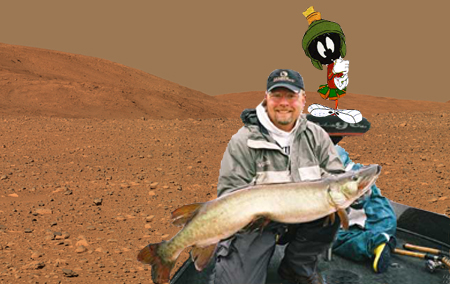 Posts: 188 Location: Madison, WI | Well, you knew after hearing that NASA found evidence of water on Mars that a MuskieFirst expedition was not far behind. Turns out that, much like St. Clair, the water is shallow (as you can see by the picture) and loaded with great muskies. According to those who attended the 1st Annual MF Mars Outing "Finding a vehicle to tow our boat out here was one of the major hurdles". Finding a guide seemed like it would be an equally difficult task although upon arrival they were greeted by Marvin the greatest Martian muskie guide known to mankind (seen standing on the bump seat). "Marvin treated us well, and we caught some decent fish, but he seemed somewhat preoccupied with some rabbit... I just kept casting and tried to learn what I can for our next outing". The date for that outing has yet to be announced as the recent increase in gas prices have meant that taking Worrall's truck just isn't financially feasible. One of the surprises to the anglers attending was that Joe Bucher's Moon Secrets meant "absolutely dick" on the martian waters. According to most of those in attendances, the surface bite was "out of this world" although you could wear a Top Raider down to a nub in about 10 casts. Rumors regarding an outing to Haley's Comet have yet to be confirmed but sightings of a launch vehicle being built below the surface of Pelican Lake are only adding to the speculation. Good luck and godspeed boys... and you may want to take along a convertor. I think Haley's is 220 only. Edited by Craig Eversoll 6/14/2004 1:43 PM Attachments ---------------- Mars.jpg (124KB - 213 downloads) | ||