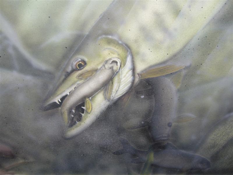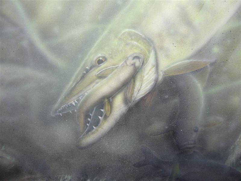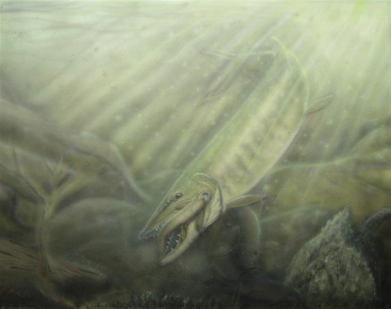 Posts: 680 Location: Muskoka Ontario,Canada | Great observation actually! I recently saw on Youtube a video clip of some baby pike feeding in a tank and one them was suspending near the surface then suddenly darted downwards to grab an approaching baitfish. I think that it used its lateral line to know where its prey was as I don't believe they can see downwards like that. It was one of the reasons for this painting being as it is. I resisted the urge to put one of my baits in its mouth...thought it might be a tad indulgent. lol | ||