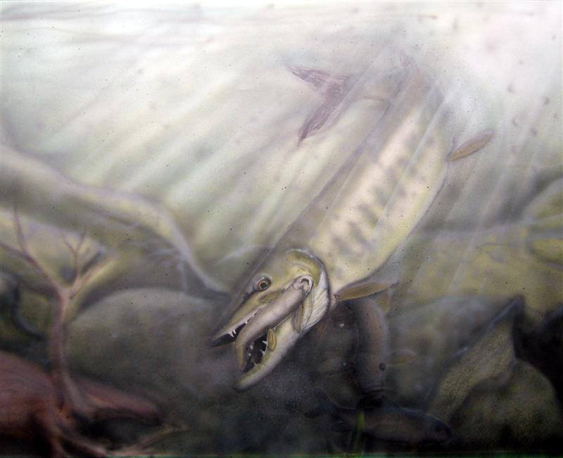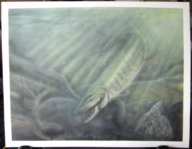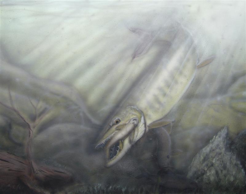 | You're a better painter than I am, but I'm afraid I agree that it's not front cover worthy. Here are the specific reasons: 1) The background lacks sharpness and detail. You explain that the water is murky, and that's fine; but my point is that the painting itself is murky (like is has a screen or film over it) regardless of your reasons. There are a number of examples of murky water paintings out there that you could look at and potentially learn from. In Mark Susinno's "On the Figure Eight" the water is tan in color. It reminds me of LOTWs, which is somewhat clear but not perfectly clear most of the time. In the painting, the color of the water is displayed in the background and the appearance of the branches below the fish helps me understand that the water is not perfectly clear. But the color of the water certainly doesn't overwhelm the painting, which to me makes it very well done. 2) The suckers look silly between their overly detailed mouths and giant fins. I would guess that you focused too much on painting those features which detracted from the high level appearance. If that's the case, I'd suggest concentrating on painting the whole fish and leaving some of that detail (especially the mouths) out. 3) The head and "torso" of the musky look good. So does the pectoral fin. I agree with the comments on the tail. Also, the fish overall doesn't look all that natural. It looks like a musky sticker that was placed onto a muddled background rather than like it belongs in the painting. I'd suggest working on "flow" with your next painting. You're a talented amateur airbrush painter, but it doesn't seem like you are being honest with yourself about your skill level. I also think it would be exceedingly difficult to do a painting with an airbrush that looks truly realistic. Airbrush work in general always seems fuzzy or hazy, much like this painting. I hope this constructive criticism is helpful. Keep at it and HAVE FUN! | |||